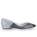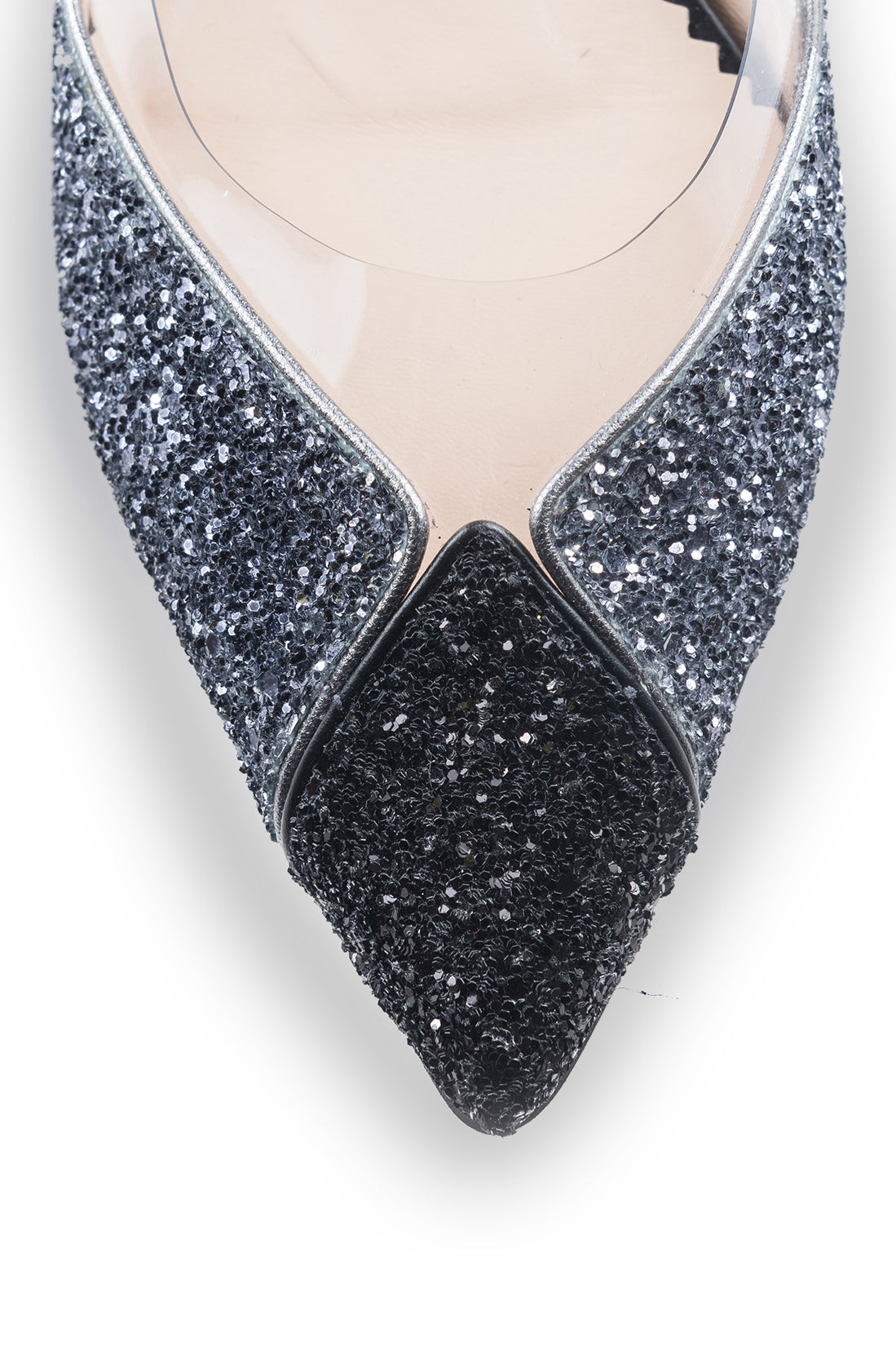 Un ștaif acoperit cu glitter este montat pe tocul mic pentru un impact vizual minimalist, dar izbitor.