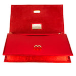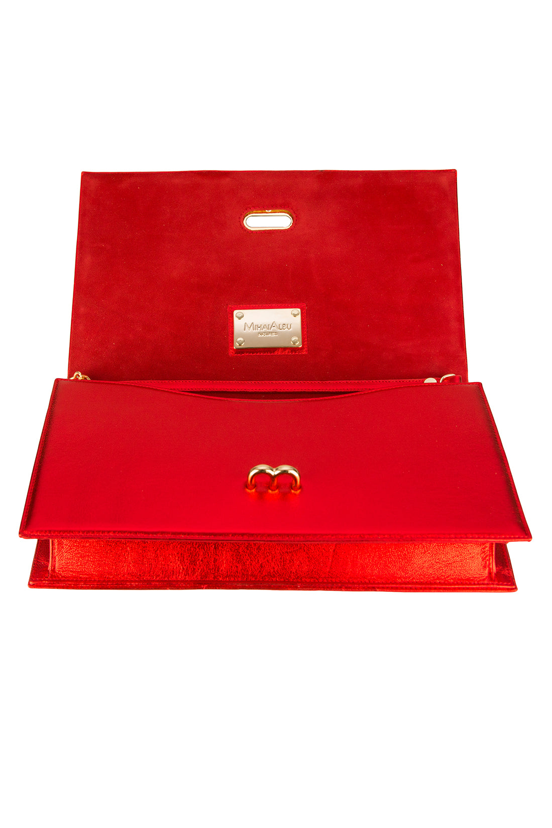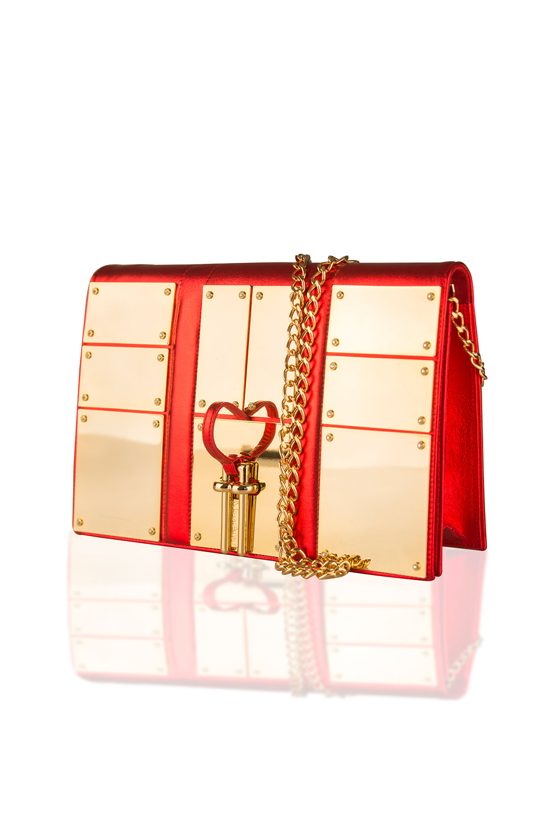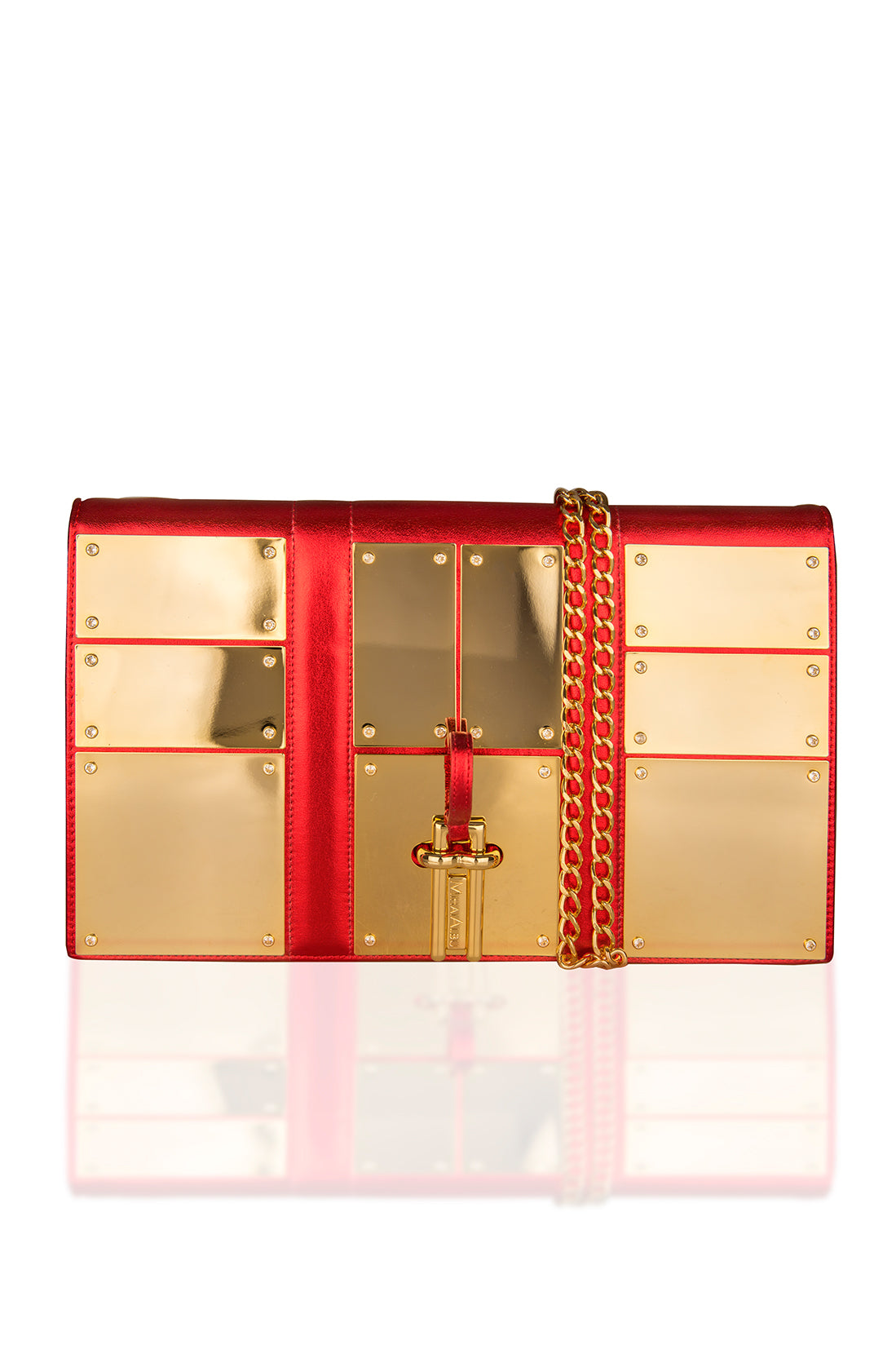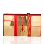 Nouă plachete aurii metalizate tip oglindă formează o fațadă deluxe alături de clema cu două vârfuri care se prinde în închizătoarea în formă de M. Interiorul clapei în nuanțe de roșu regal creează un design uniform alături de compartimentul realizat din piele și poliester. Fabricată din piele, geanta clutch are un lanț auriu reglabil și detașabil, care îți permite să o porți pe umăr cu ușurință.