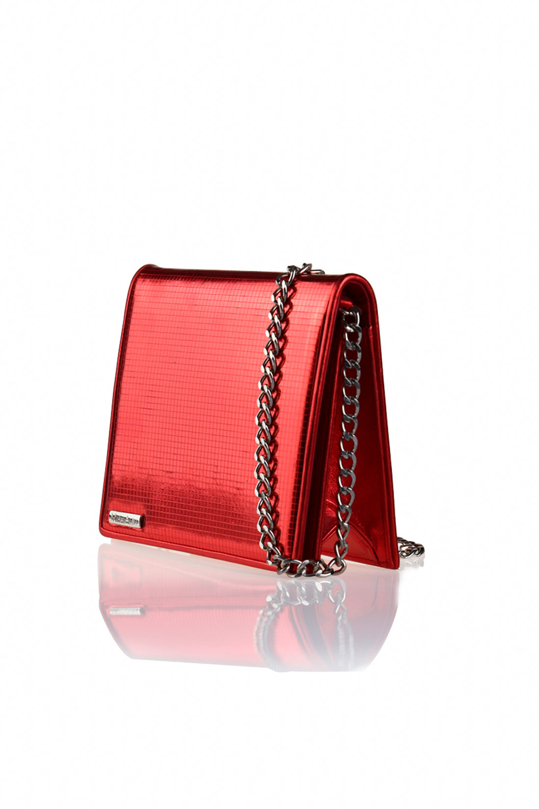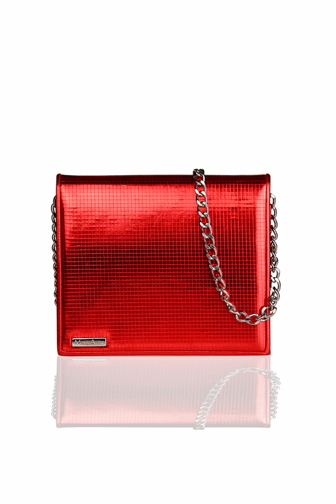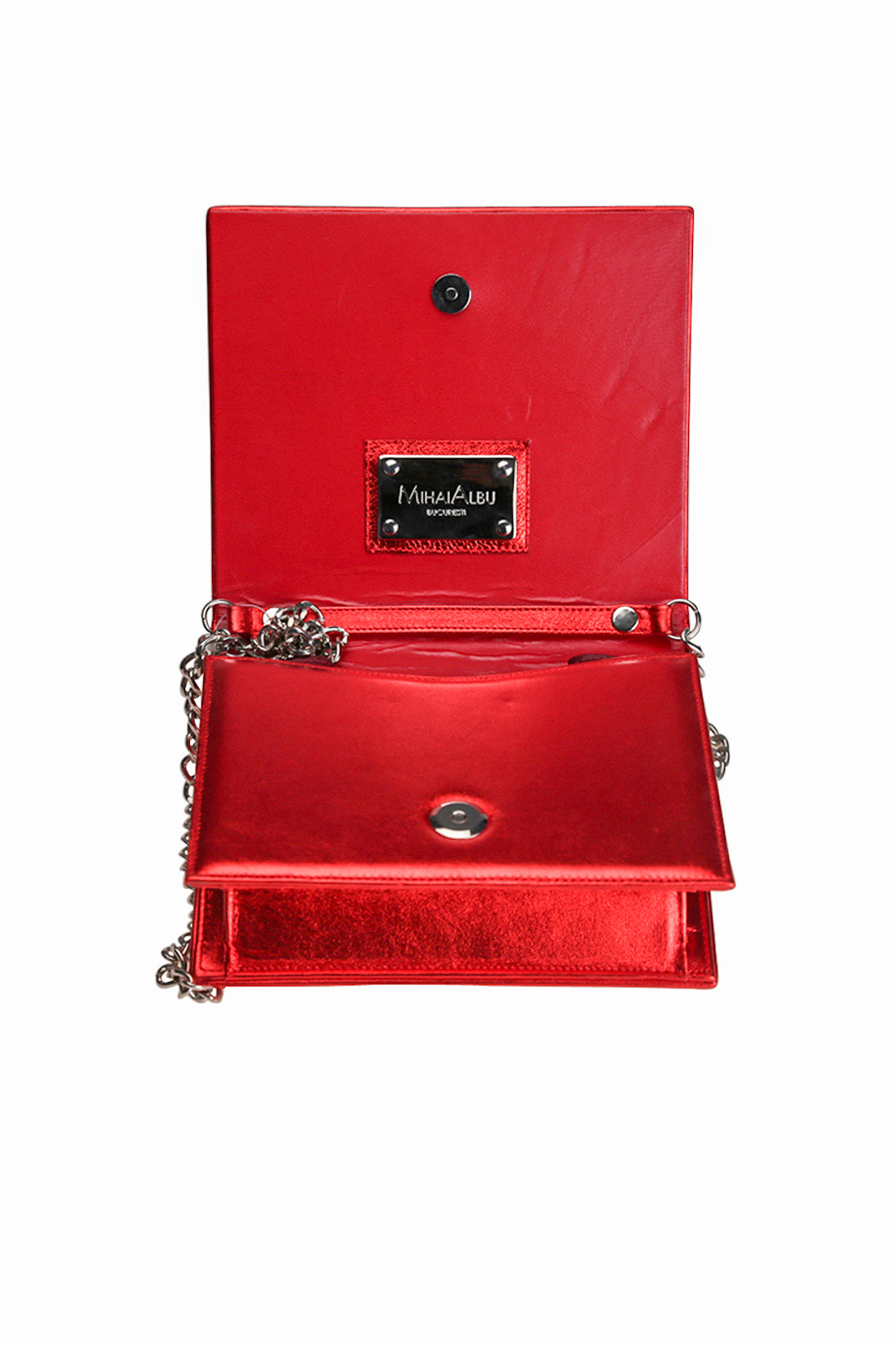 Partea frontală cu finisaj clasic prezintă logo-ul lui Mihai Albu, creând o sinergie seducătoare între nuanțele argintii și roșii reflectorizante. Sistem de închidere cu magnet. Interiorul clapei, alături de compartimentul realizat din piele și poliester, creează un joc senzual de sentimente ascunse. Fabricată din piele, geanta clutch are un lanț argintiu reglabil și detașabil, care îți permite să o porți pe umăr cu ușurință.