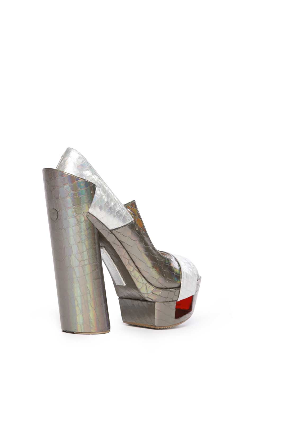 Un ștaif argintiu și confortabil este ascuns de un stiletto în formă de turn, care metamorfozează piciorul într-o piesă de arhitectură postmodernistă.