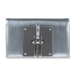 O plachetă argintie metalizată tip oglindă este unită cu o clemă cu două vârfuri care se prinde în închizătoarea în formă de M. Interiorul clapei în nuanțe argintii creează un design uniform alături de compartimentul realizat din piele și poliester. Fabricată din piele, geanta clutch are un lanț argintiu reglabil și detașabil, care îți permite să o porți pe umăr cu ușurință.