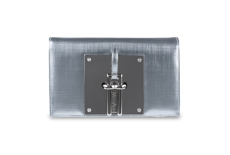 Geanta de mână din piele, cu clapă pe toată lungimea, în nuanțe argintii reflectorizante, este imaginată ca o cutie cu dorințe feroce. E timpul să le strigi pe nume!