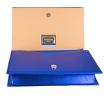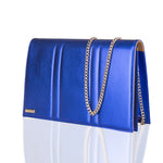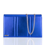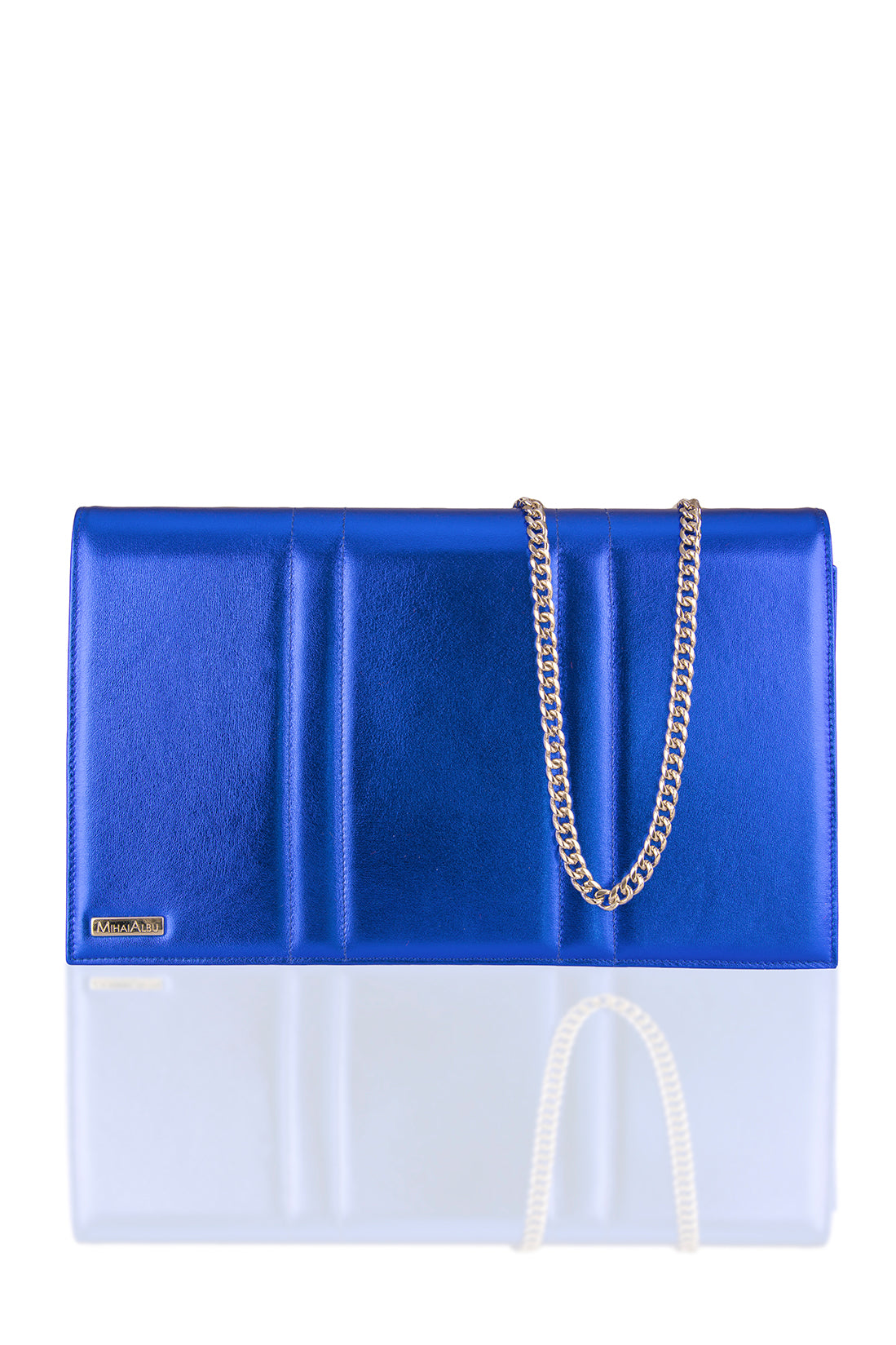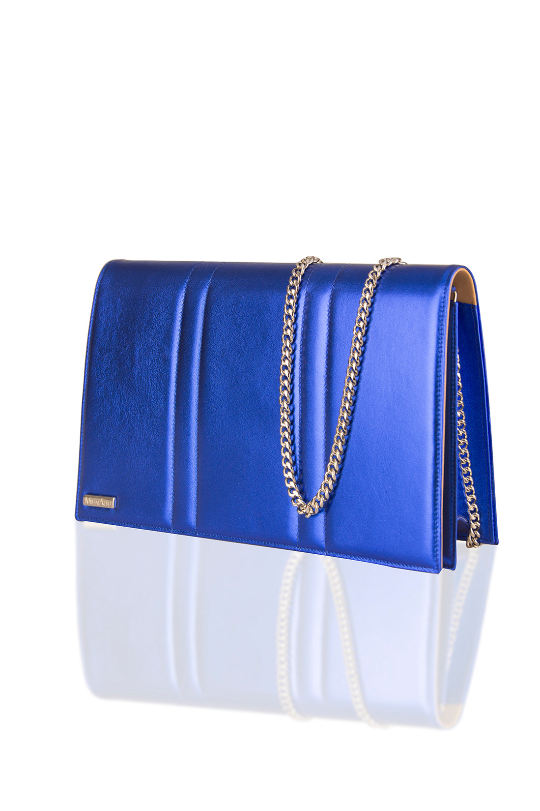Geanta de mână din piele metalizată în albastru de faraon, numită după piatra prețioasă lapislazuli, aduce omagiu mileniilor de rafinament antic. Glamour de Nefertiti!