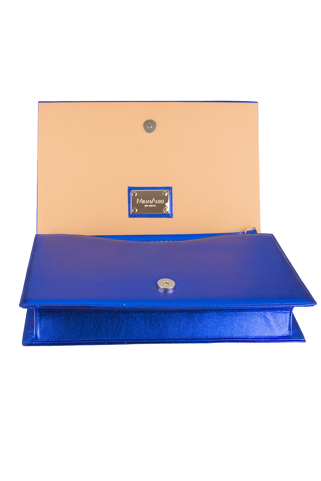 Partea frontală cu finisaj clasic prezintă logo-ul lui Mihai Albu, creând un design seducător minimalist. Sistem de închidere cu magnet. Interiorul clapei în nuanțe nud seducătoare creează un joc de lumini alături de compartimentul realizat din piele și poliester. Fabricată din piele, geanta clutch are un lanț argintiu reglabil și detașabil, care îți permite să o porți pe umăr cu ușurință.