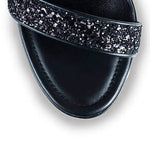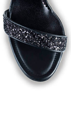 O baretă diagonală învelită în glitter mângâie curba piciorului pe o talpă interioară din piele șlefuită, pentru o senzație fresh.