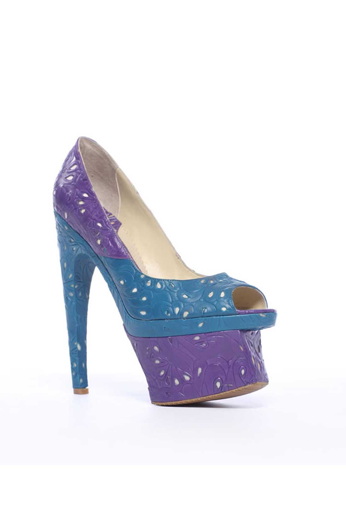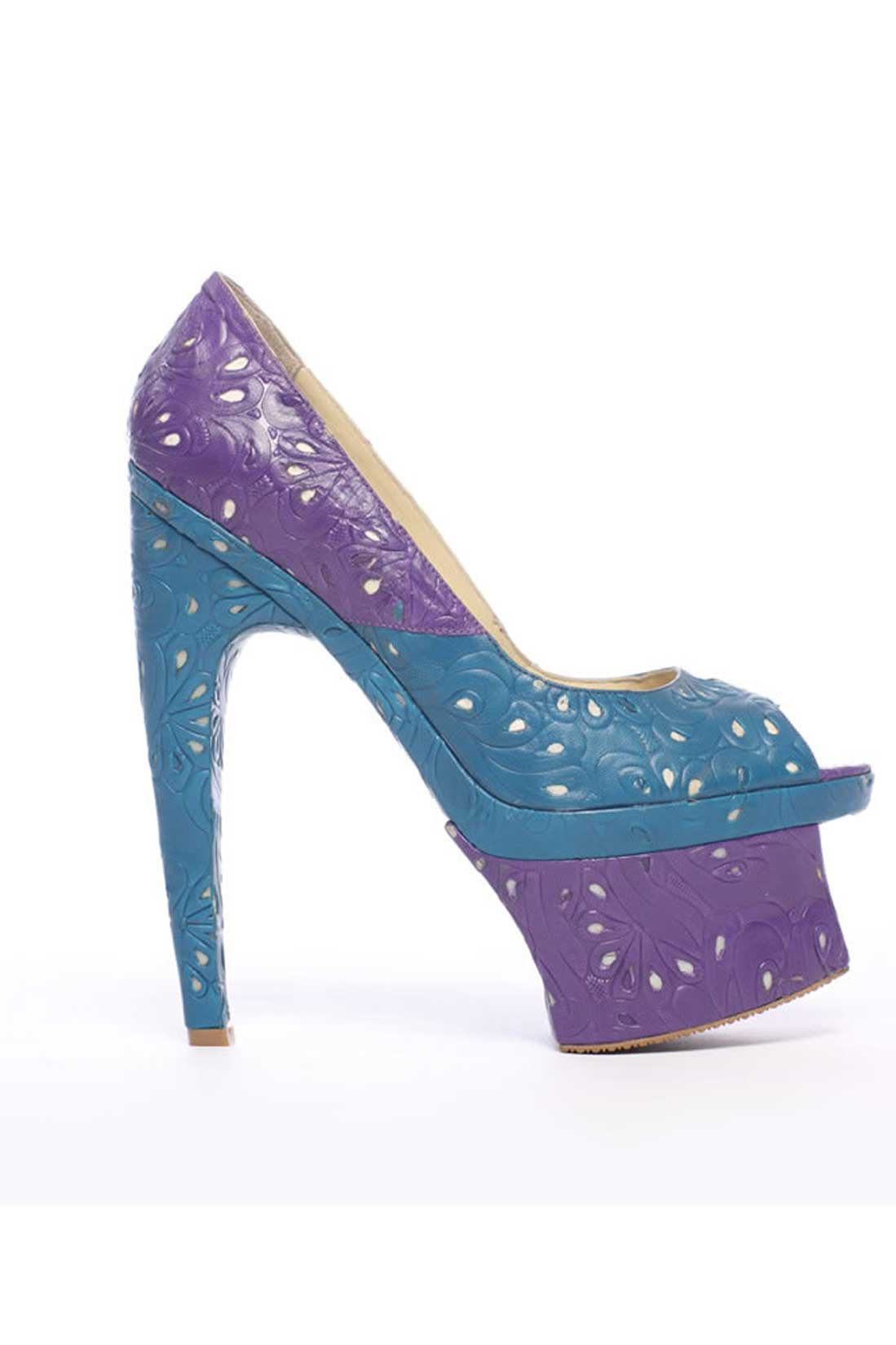 Un decupaj clasic în față mângâie piciorul pe un branț din piele, echilibrându-se pe o platformă care poartă culorile altarelor move Shinto.