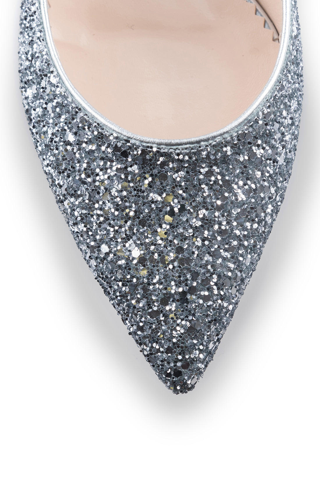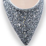 Un ștaif acoperit cu glitter este montat pe tocul mic pentru un impact vizual minimalist, dar izbitor.