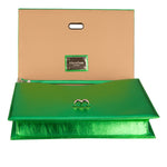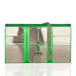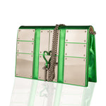 Geanta de mână din piele metalizată cu specchio reflectă flora luxuriantă și designul rafinat din Grădina Botanică Regală Kew și este imaginată ca o oază tropicală.