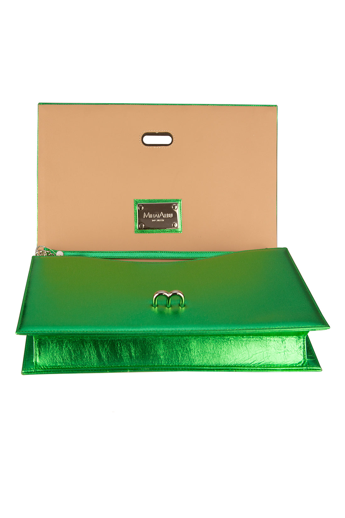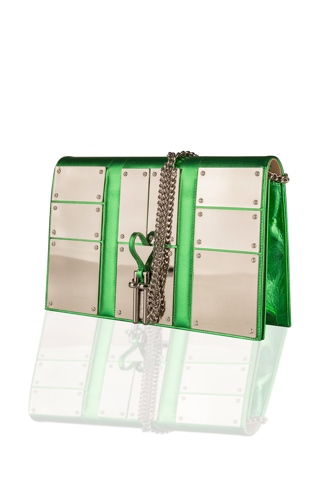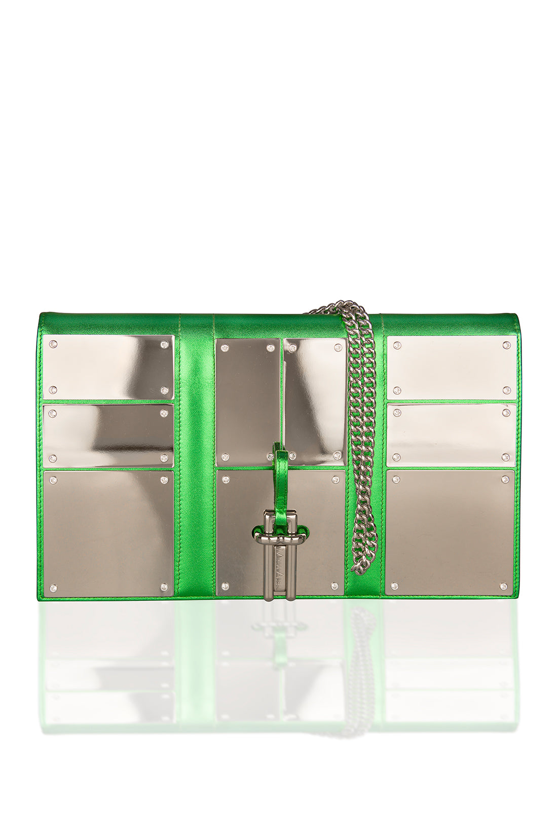 Nouă plachete argintii metalizate tip oglindă formează o fațadă deluxe alături de clema cu două vârfuri care se prinde în închizătoarea în formă de M. Interiorul clapei în nuanțe bej seducătoare creează un joc de motive organice alături de compartimentul realizat din piele și poliester. Fabricată din piele, geanta clutch are un lanț argintiu reglabil și detașabil, care îți permite să o porți pe umăr cu ușurință.