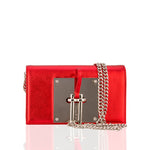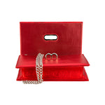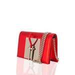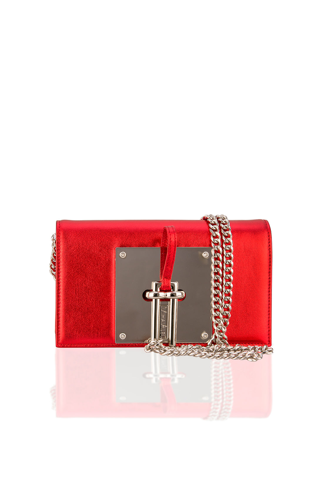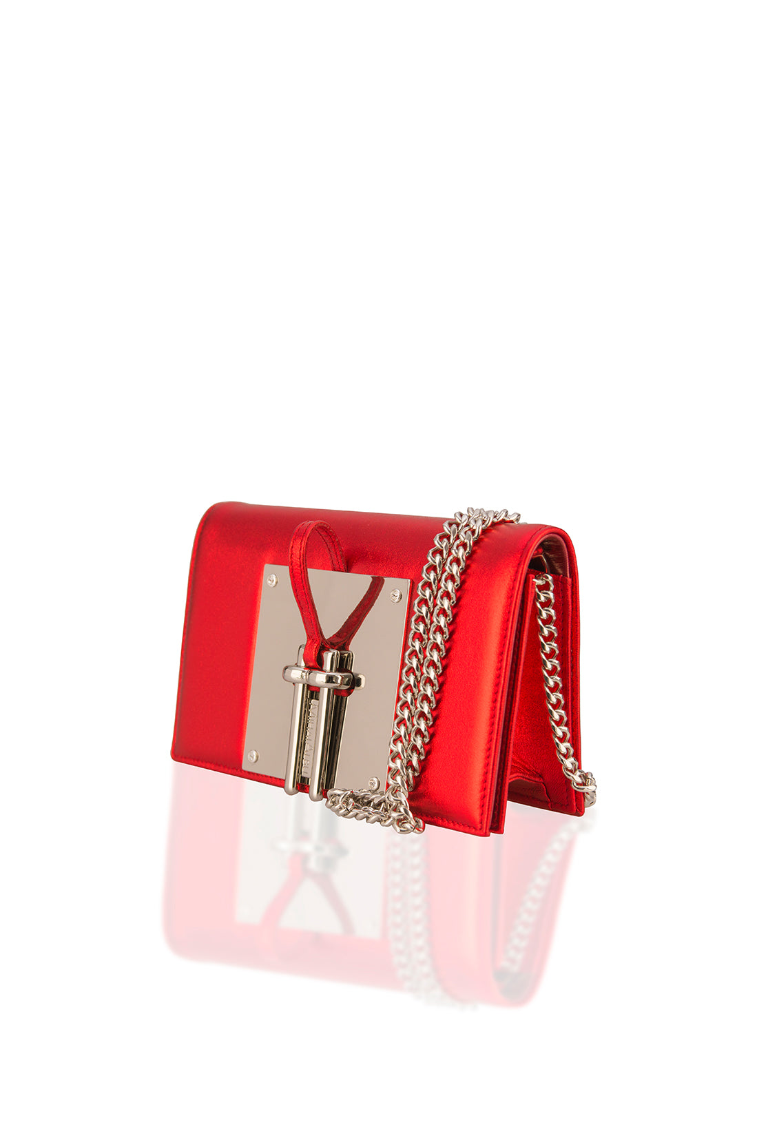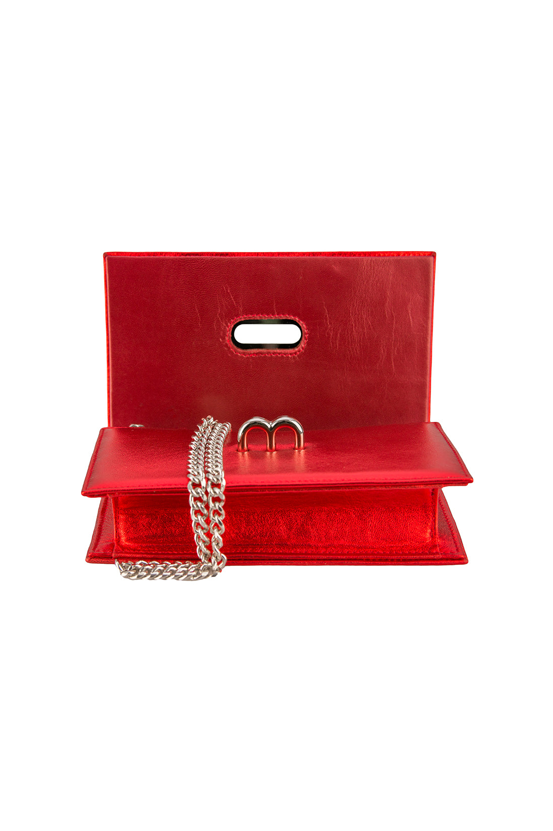 O plachetă argintie metalizată tip oglindă este unită cu o clemă cu două vârfuri care se prinde în închizătoarea în formă de M. Interiorul clapei în rubiniu trandafiriu creează un design uniform alături de compartimentul realizat din piele și poliester. Fabricată din piele, geanta clutch are un lanț argintiu reglabil și detașabil, care îți permite să o porți pe umăr cu ușurință.