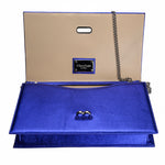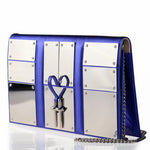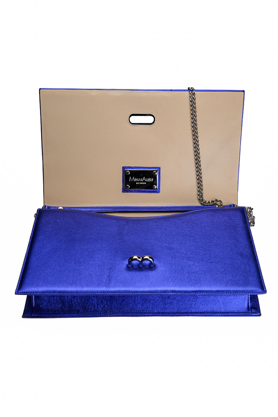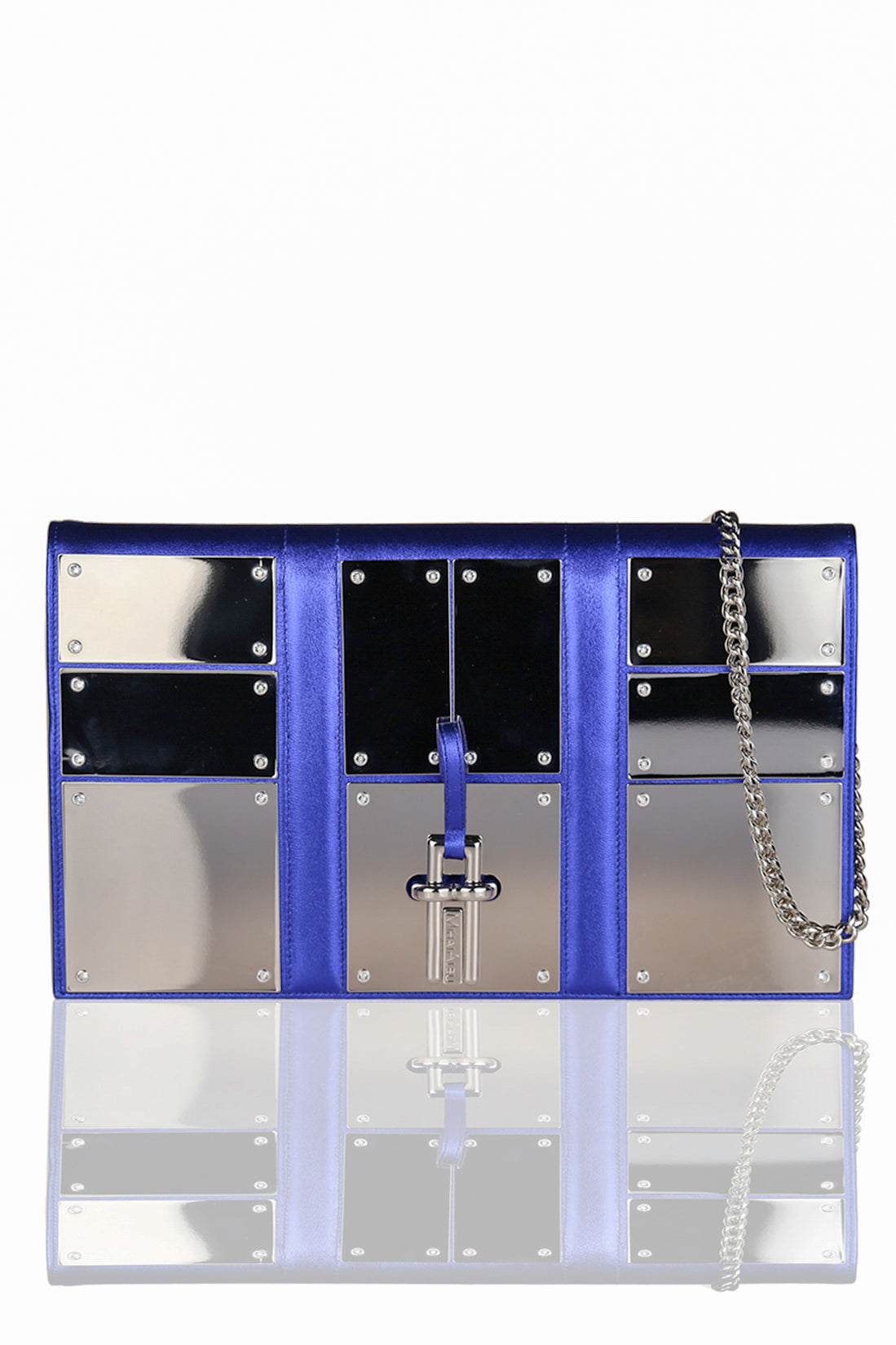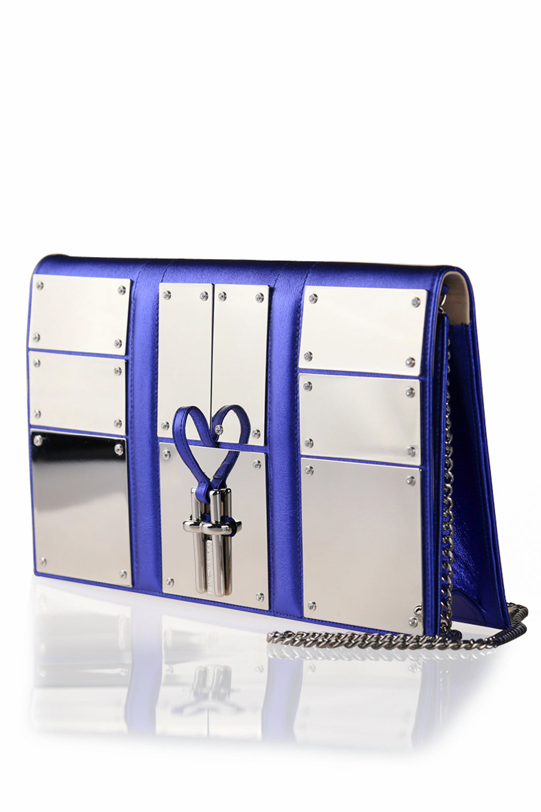 Geanta de mână din piele metalizată cu specchio reflectă prestigiul etern al colierelor cu lazurit ale Cleopatrei și este imaginată ca templul unei femei puternice.