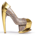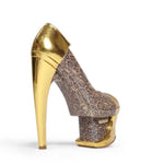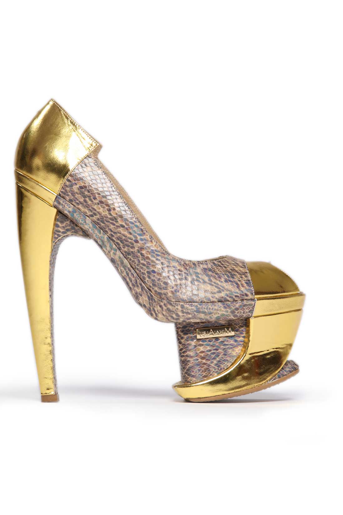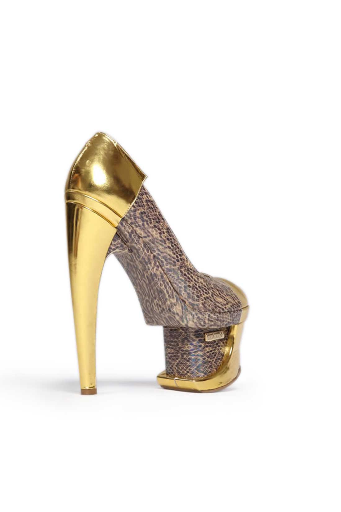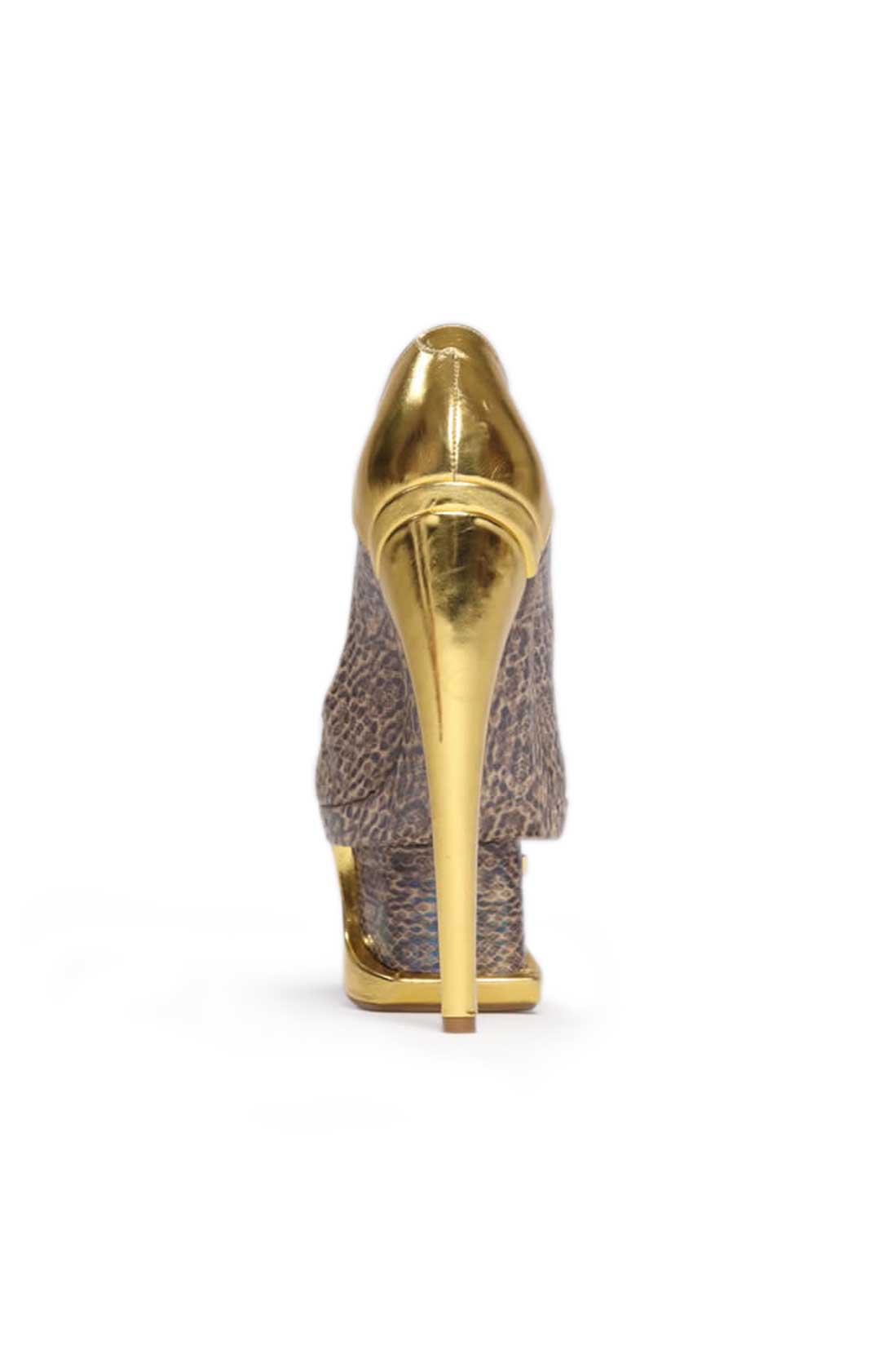 Un decupaj clasic în față mângâie piciorul pe un branț din piele, echilibrându-se pe o platformă aurie cu geometrii organice.