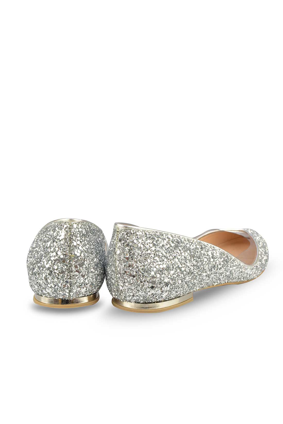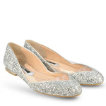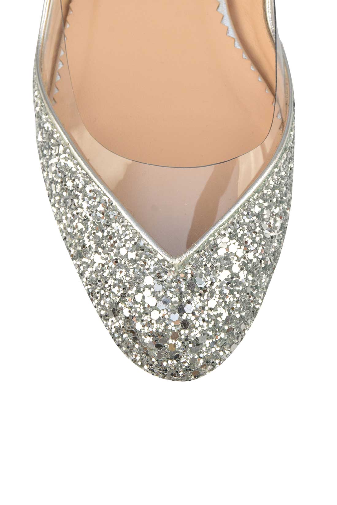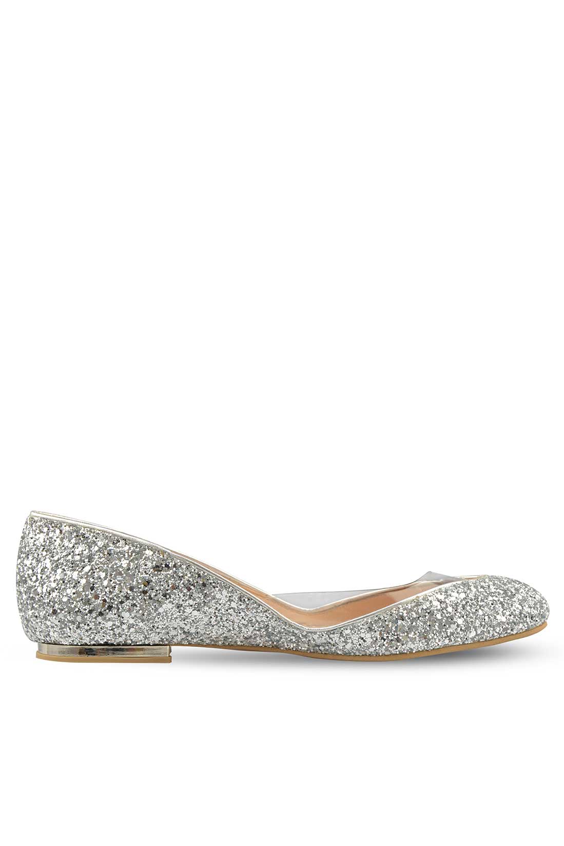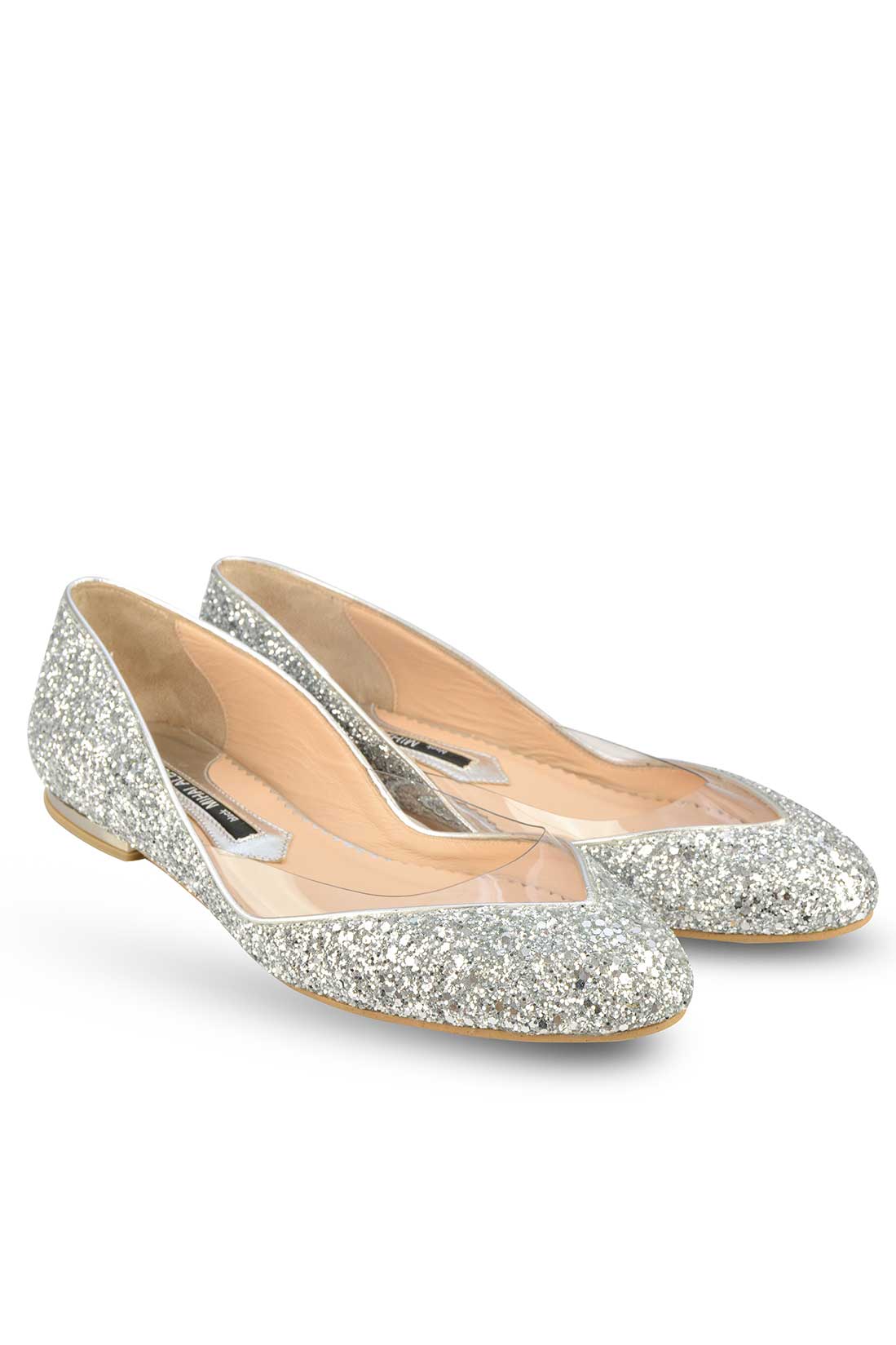 Balerinii cu glitter argintiu și un decupaj ultra transparent în stil sculptural elegant te fac să te simți ca Cenușăreasa pe tocuri joase. Fericire pură!