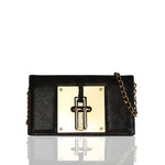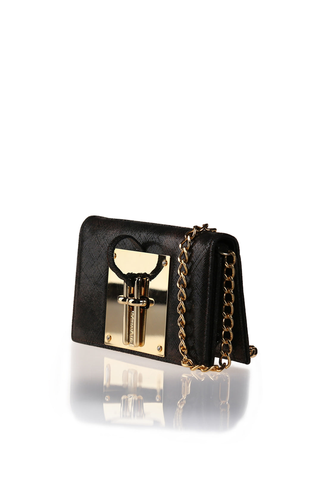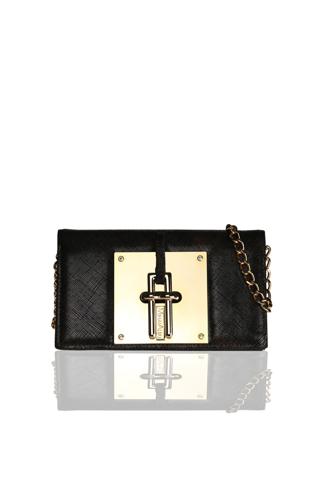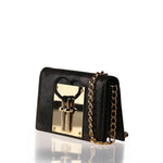 O plachetă aurie metalizată tip oglindă este unită cu o clemă cu două vârfuri care se prinde în închizătoarea în formă de M. Interiorul clapei în nuanțe clasice închise creează un design uniform alături de compartimentul realizat din piele si poliester. Fabricată din piele, geanta clutch are un lanț auriu reglabil și detașabil, care îți permite să o porți pe umăr cu ușurință.