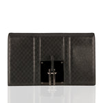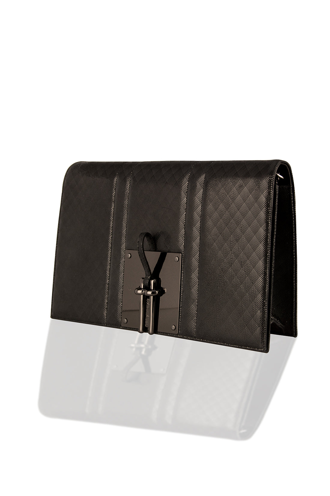 O plachetă metalizată tip oglindă este unită cu o clemă cu două vârfuri care se prinde în închizătoarea în formă de M. Interiorul clapei în nuanțe noir clasice creează un design uniform alături de compartimentul realizat din piele și poliester. Fabricată din piele, geanta clutch are un lanț argintiu reglabil și detașabil, care îți permite să o porți pe umăr cu ușurință.
