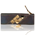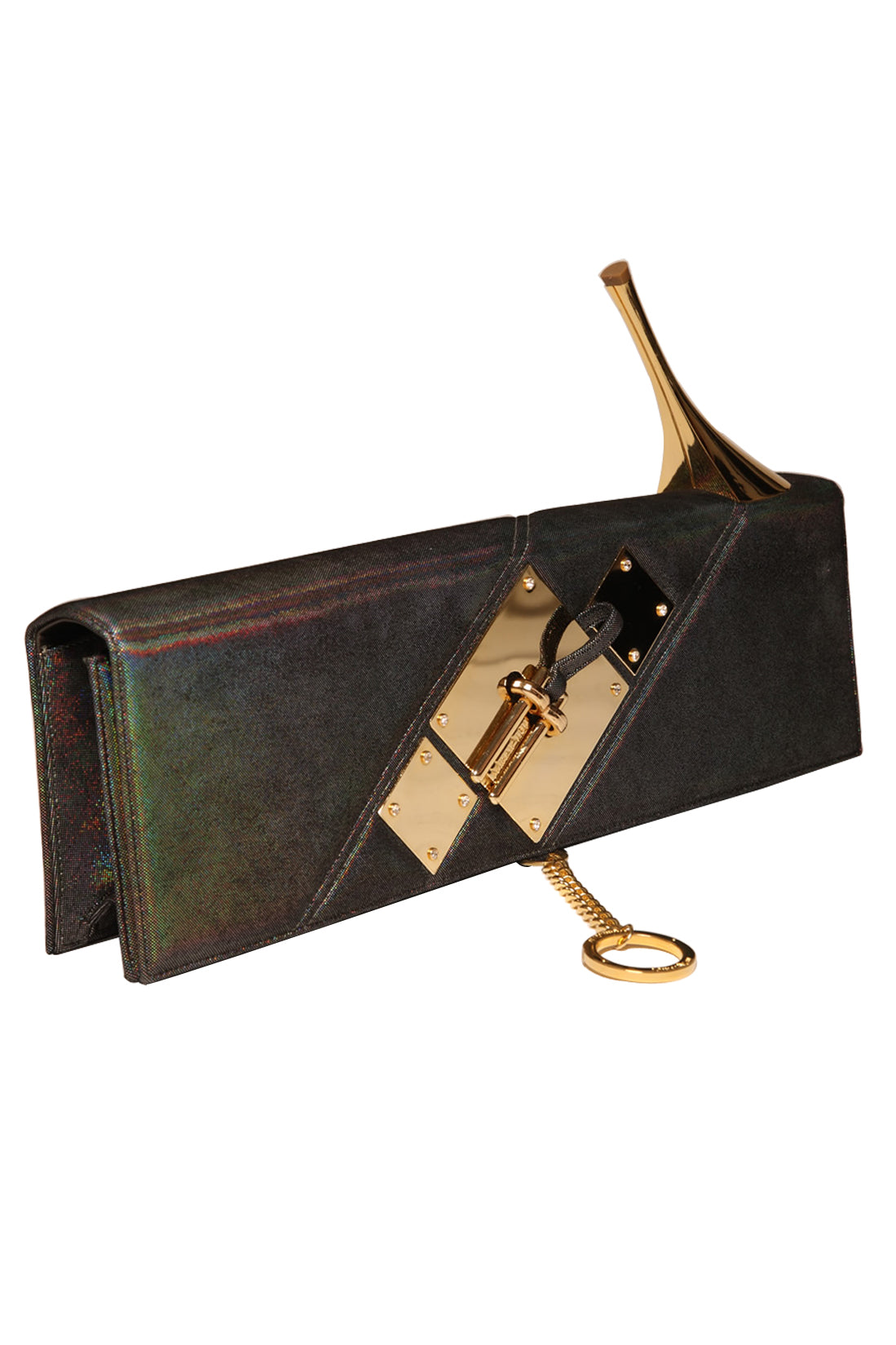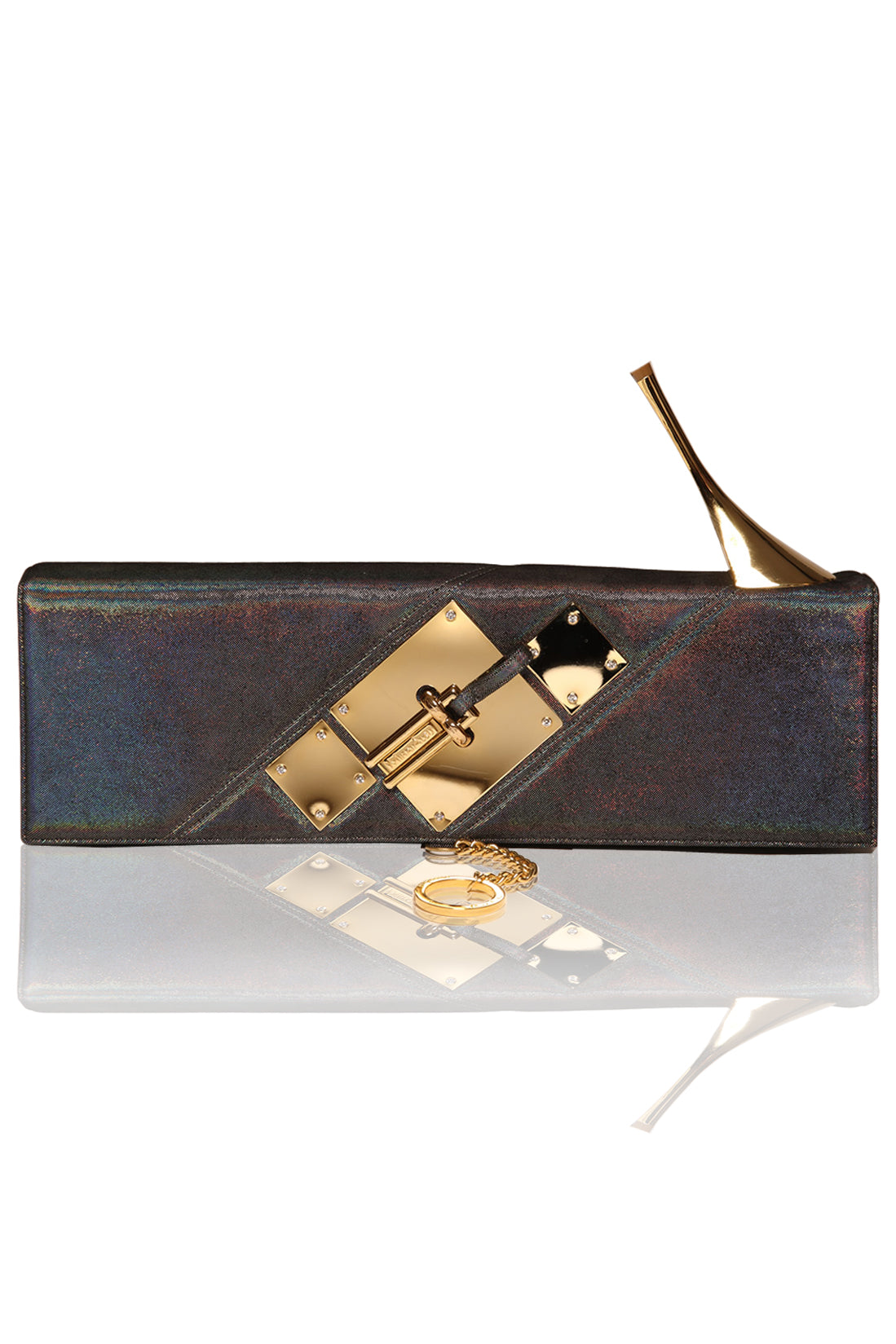 Trei plachete aurii metalizate tip oglindă formează o fațadă deluxe alături de clema cu două vârfuri care se prinde în închizătoarea în formă de M. Clapa cu un stiletto decorativ, alături de un compartiment din piele și poliester, creează un joc seducător de nuanțe reflectorizante. Poșeta plic are un lănțișor rafinat și functional cu un inel auriu, care îți oferă o prindere mai fermă atunci când o porți în mână.