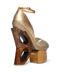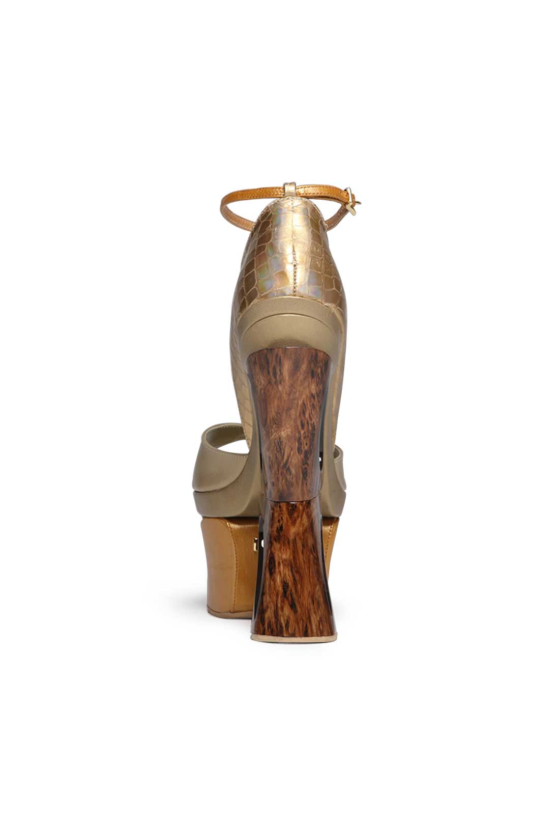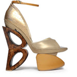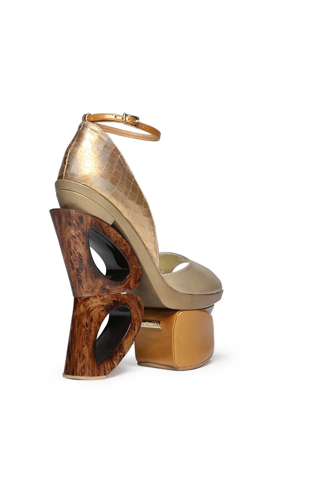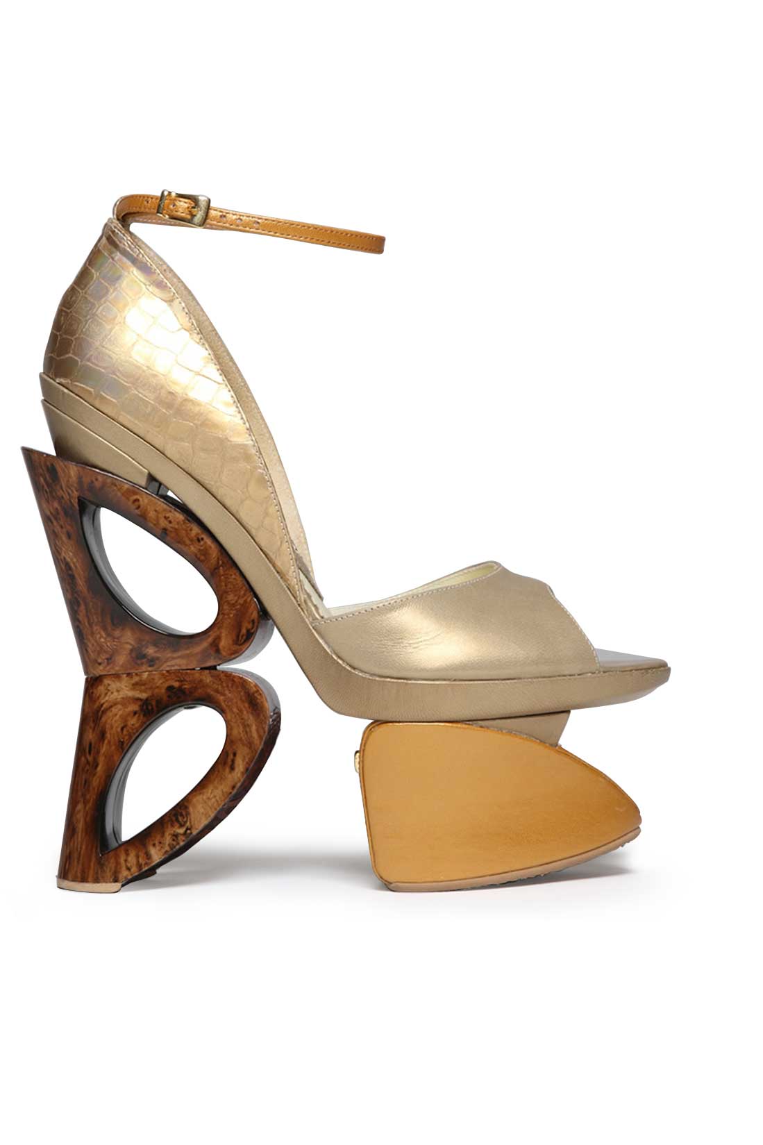 Un decupaj clasic în față mângâie piciorul pe un branț din piele, echilibrându-se pe o platformă cu geometrii organice.