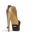 Un decupaj clasic în față mângâie piciorul pe un branț din piele, echilibrându-se pe o platformă care adăpostește o perlă în echilibru perfect cu perla de pe stiletto.